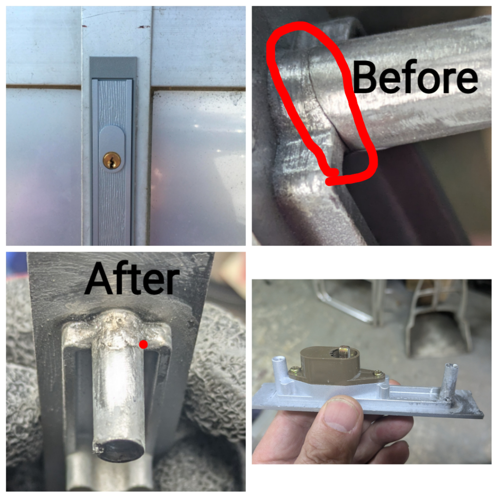 引戸の鍵交換と外した鍵の破損カ所を溶接修理しました。この鍵結構高額なので、予備にして頂きました。
